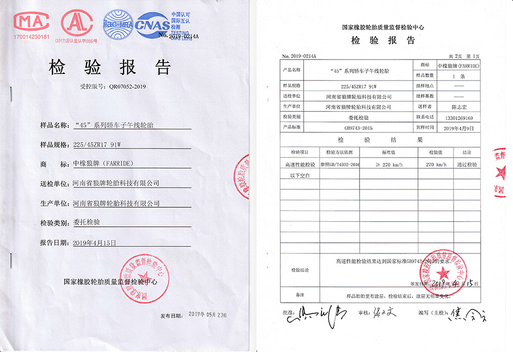 中橡狼牌輪胎高速性能檢測報告